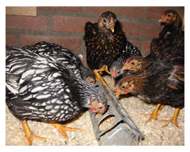 Hier zie je Wyandotte Kuikens van zes weken oud.